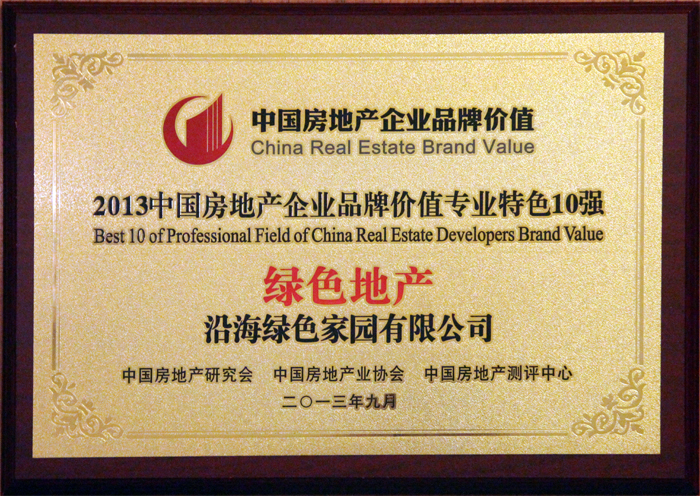 2013年9月17日,由中國房地產研究會、中國房地產業協會和中國房地產測評中心聯合主辦的“2013中國房地產品牌價值測評成果發布會”在北京召開,沿海綠色家園集團(以下簡稱沿海集團)蟬聯健康綠色地產榮譽,榮獲“2013中國房地產開發企業品牌價值專業特色10強—綠色地產”。
