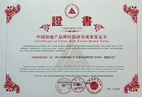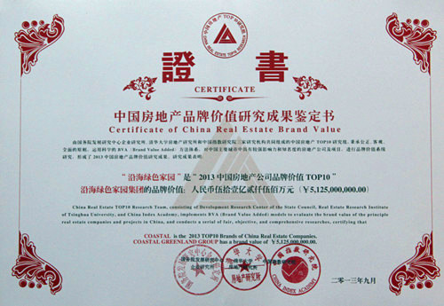 2013年9月12日,“2013中國房地產品牌價值研究成果發布會暨第十屆中國房地產品牌發展高峰論壇”在國家會議中心召開,沿海綠色家園集團(以下簡稱“沿海集團”)憑借持之以恒的品牌建設,以及對“健康住宅”的堅持和戰略推動,以51.25億元的品牌價值榮獲“2013年度中國房地產品牌價值TOP10”和“2013年中國房地產專業領先品牌TOP10-健康住宅”。這是沿海集團連續十年蟬聯“中國房地產品牌價值TOP10”,連續九年蟬聯“健康住宅專業領先品牌”。
